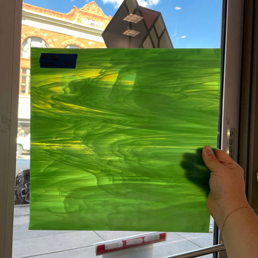 Green and white wispy semi-opaque glass. Made by Spectrum!