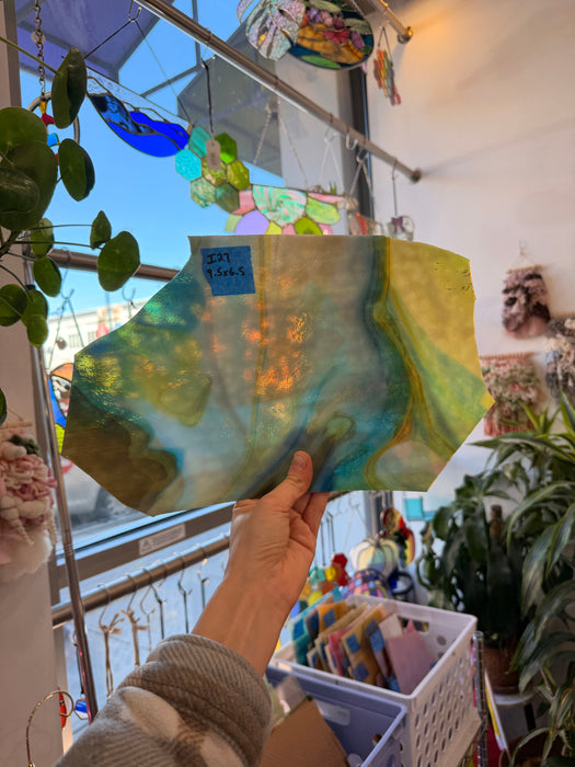 Unique blue, white, and amber mixed glass made by Chicago Art Glass. Vintage made in the 80s.