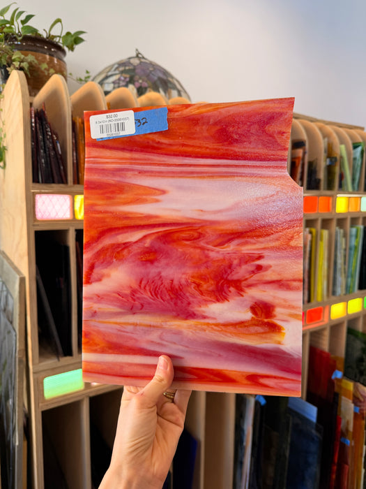 Red, orange, and white mixed opaque glass made by Kokomo.